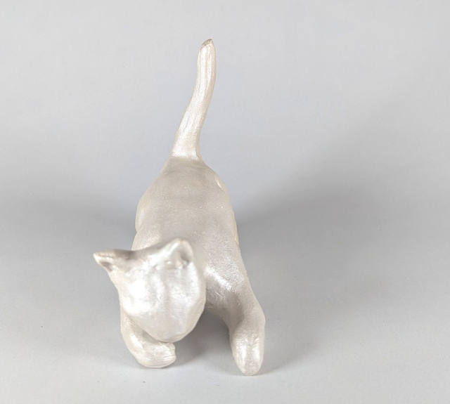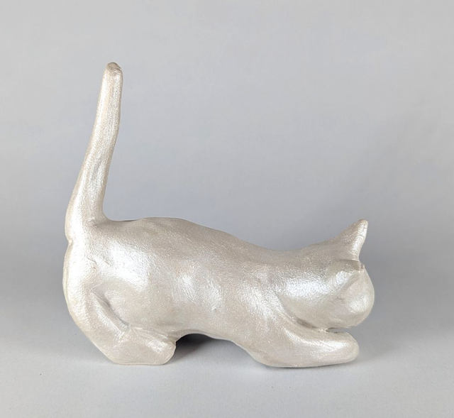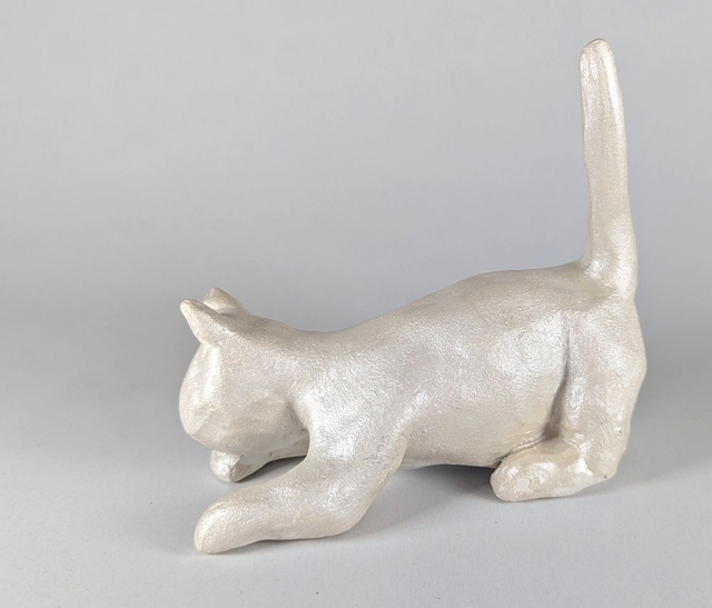 Chat qui joue, blanc irisé. Sculpture céramique modelée et peinte à la main en France.