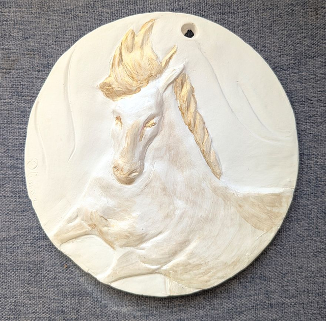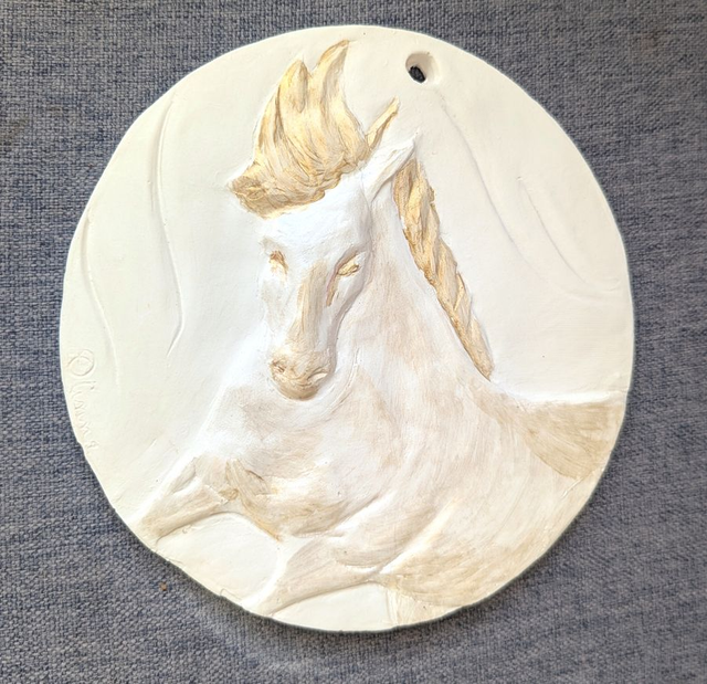 Thème cheval. Médaillon de 15cm de diamètre à accrocher pour décorer une chambre. "Nuage" est un cheval blanc irisé et aux accents dorés qui lui donnent l'aspect célèste.