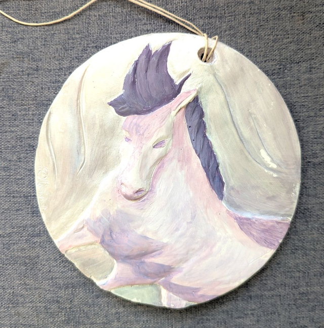 Thème cheval. Médaillon de 15cm de diamètre à accrocher pour décorer une chambre. "Rêve" est un cheval blanc et violet qui rappelle l'esthétique des licornes.