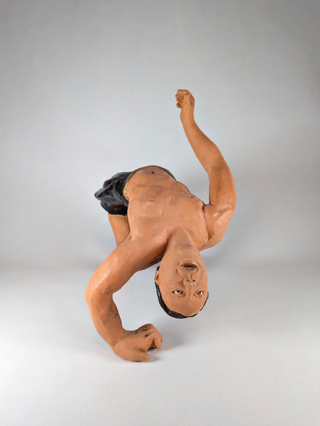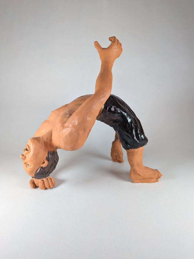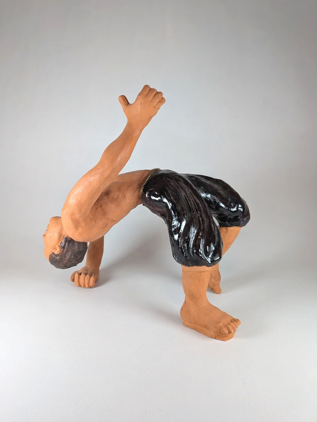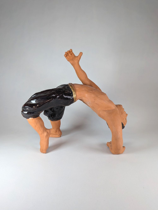 Sculpture céramique de la série danse. Modelage figuratif réaliste modelé et peint à la main. Danseur en train de réalisé le début d'un salto arrière. Argile rouge. Peinture noire et dorée.